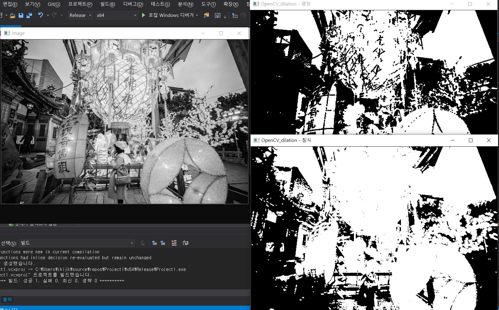 그리고 출력된 영상은 morphologyEx함수를 이용해서 모폴로지 팽창/침식 연산을 해준 것입니다.