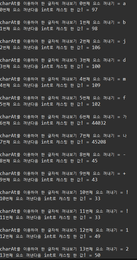 System.out.println("charAt를 이용하여 한 글자씩 꺼내보기 "+ i +"번째 요소 꺼내기 = " + str.charAt(i));