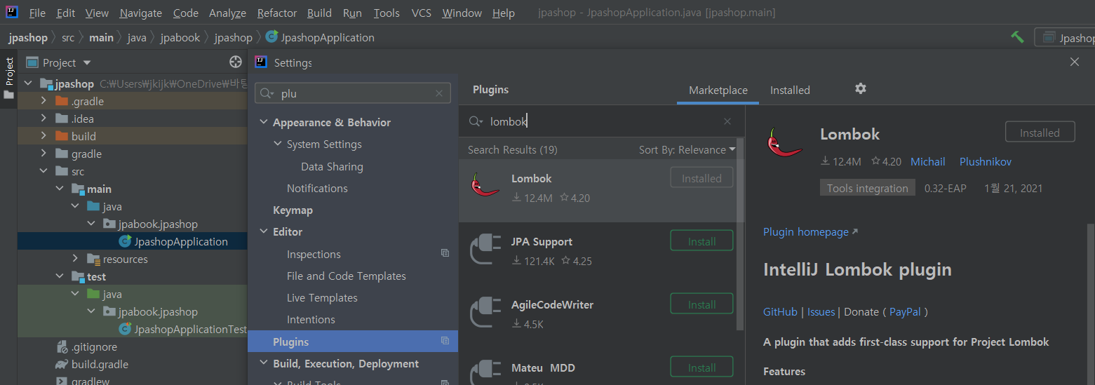 - Setting > Plugins > lombok 검색 을 하게되면 Lombok이 installed라고 되어있다. 그러면 설치가 되어 있는것이다.