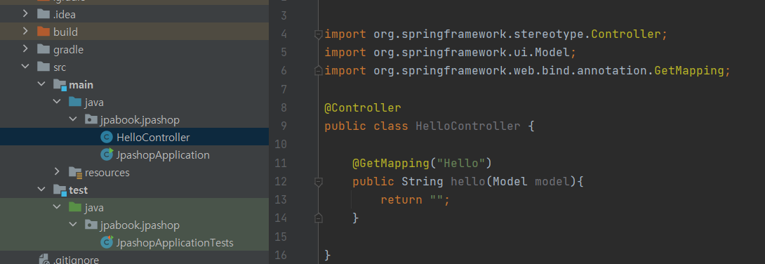 그 전에, 메인 메서드 (JpashopApplication)에서 Hello클래스를 선언하고 생성해주어야 한다.