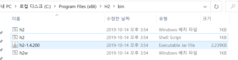 3. 설치한 파일에서 bin 폴더의 h2(Windows 배치 파일)파일을 실행을 해주어야 한다.